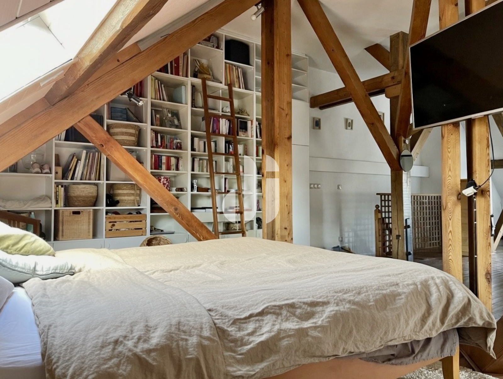 Au second niveau, un espace parental de plus de 70 m² au sol regroupant espace nuit, salle de bain avec second wc, coin dressing et espace télétravail. Agencement possible pour créer une chambre supplémentaire facilement.