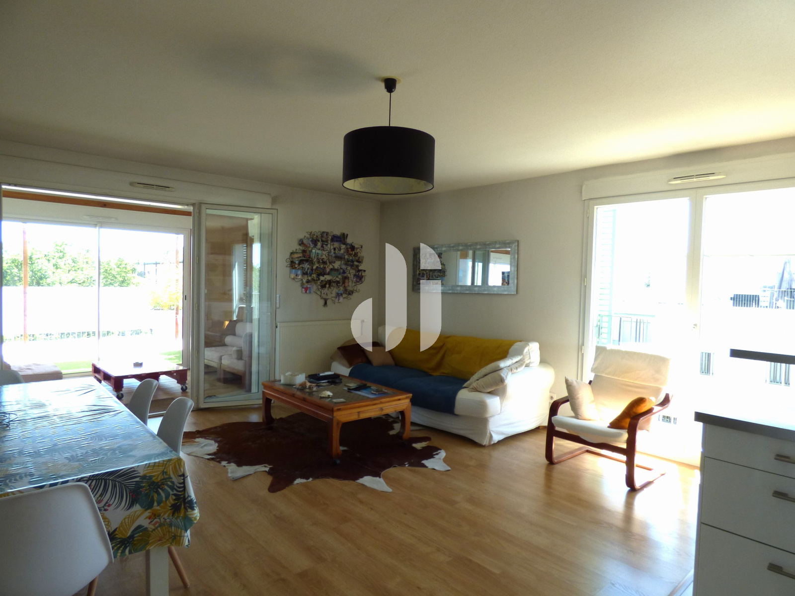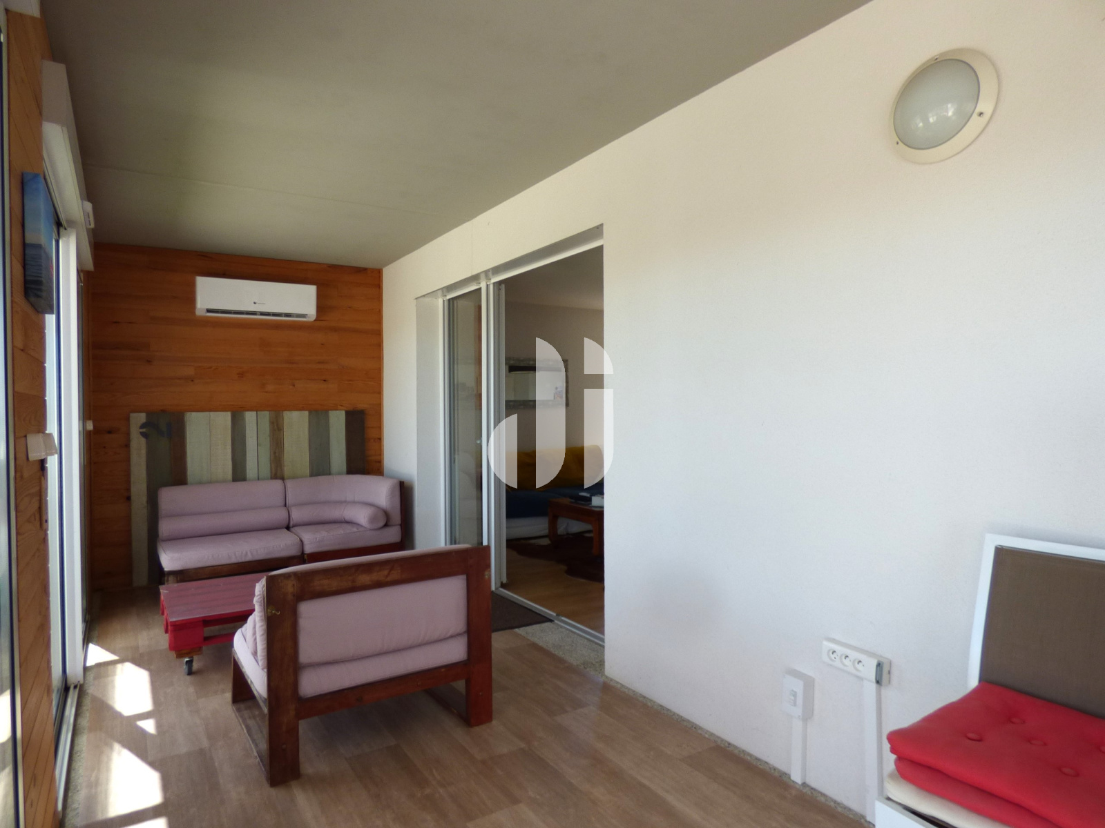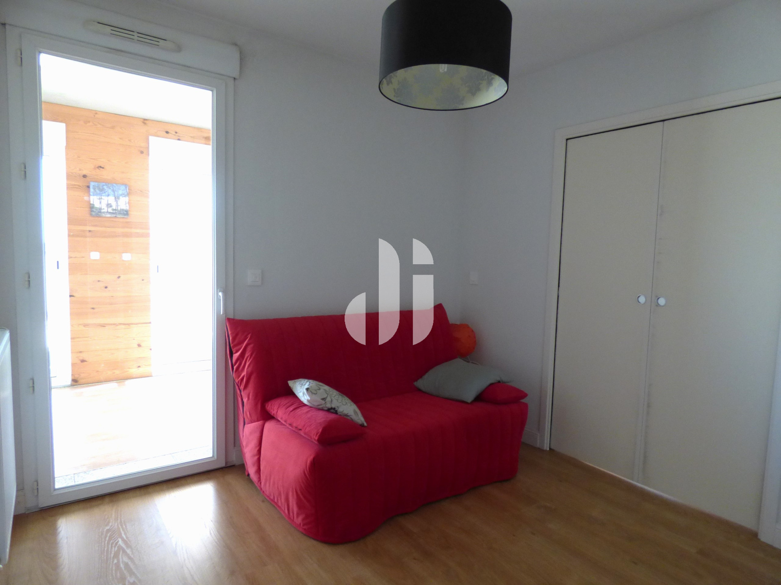 Parquet flottant - placard 3 portes - Porte-fenêtre PVC blanc donnant sur la véranda avec SDE attenante