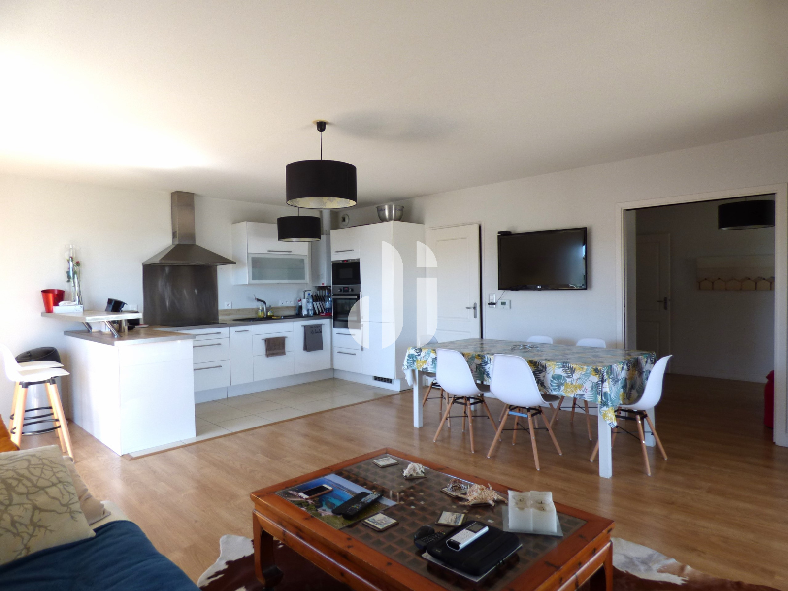 Parquet flottant - porte-fenêtre en PVC Blanc avec VRE Cuisine avec carrelage équipée et aménagée : plaque vitro + hotte + four + micro-ondes + lave-vaisselle