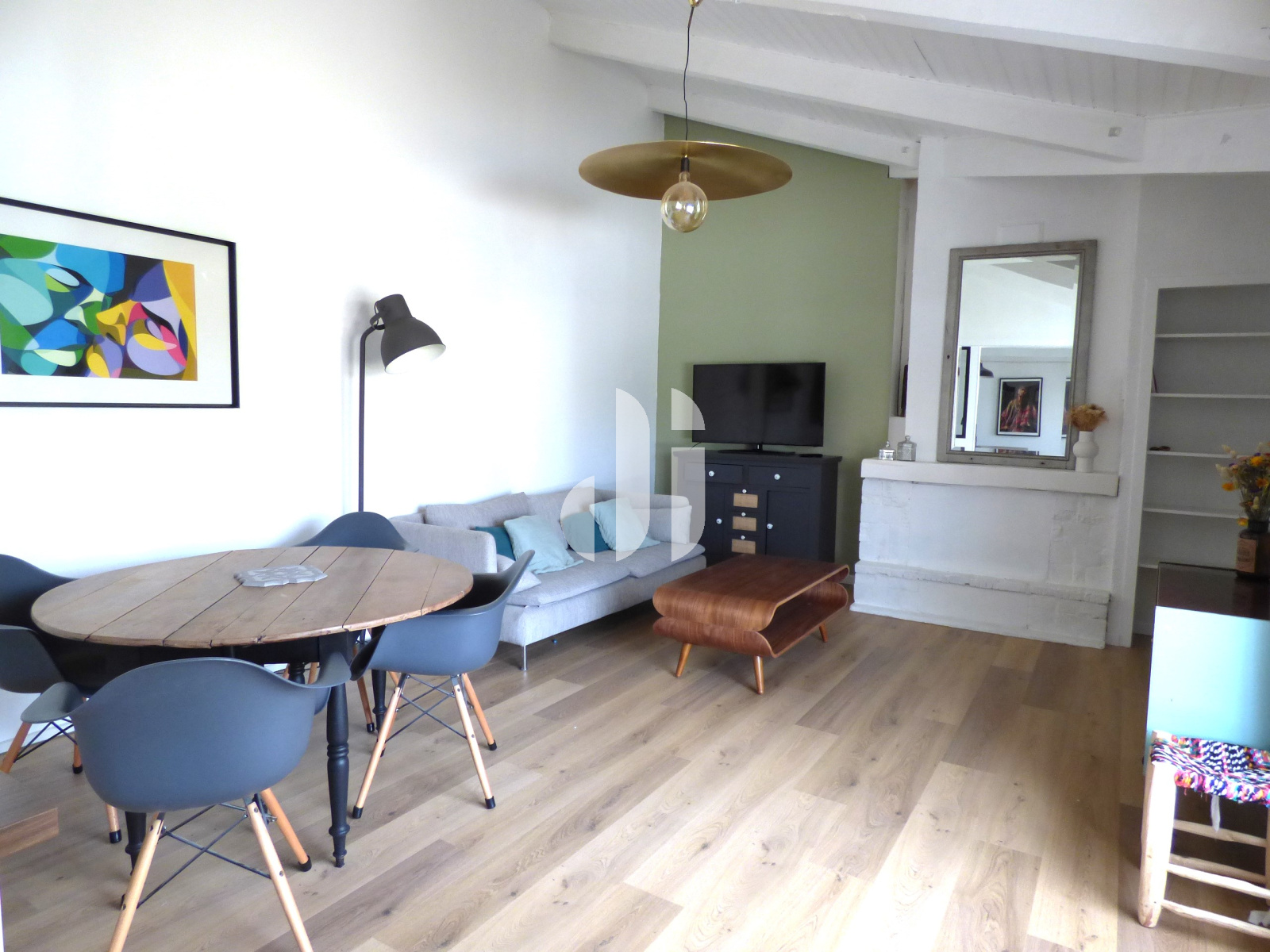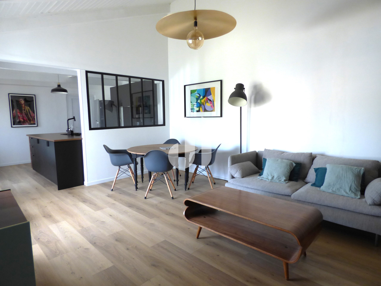 Parquet flottant au sol - semi ouverte avec verrière - meubles - plaque induction - réfrigérateur - lave-vaisselle - hotte -