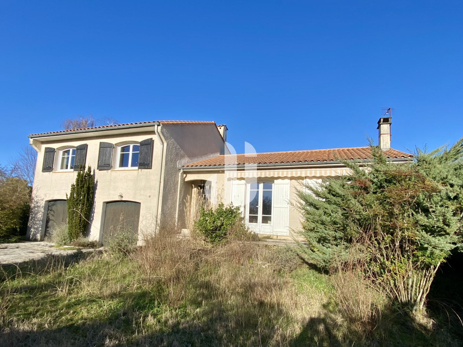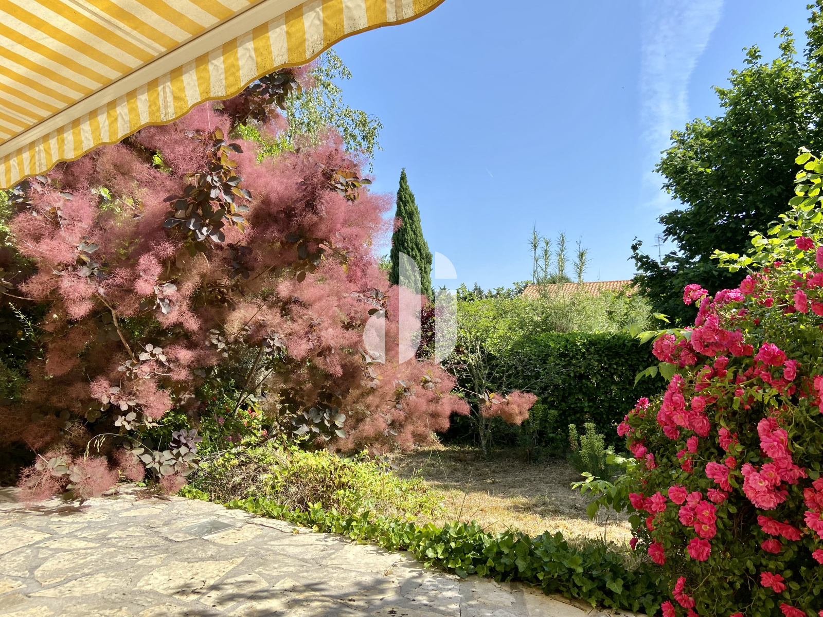 côté entrée. Mêmes dalles au sol, store banne électrique.