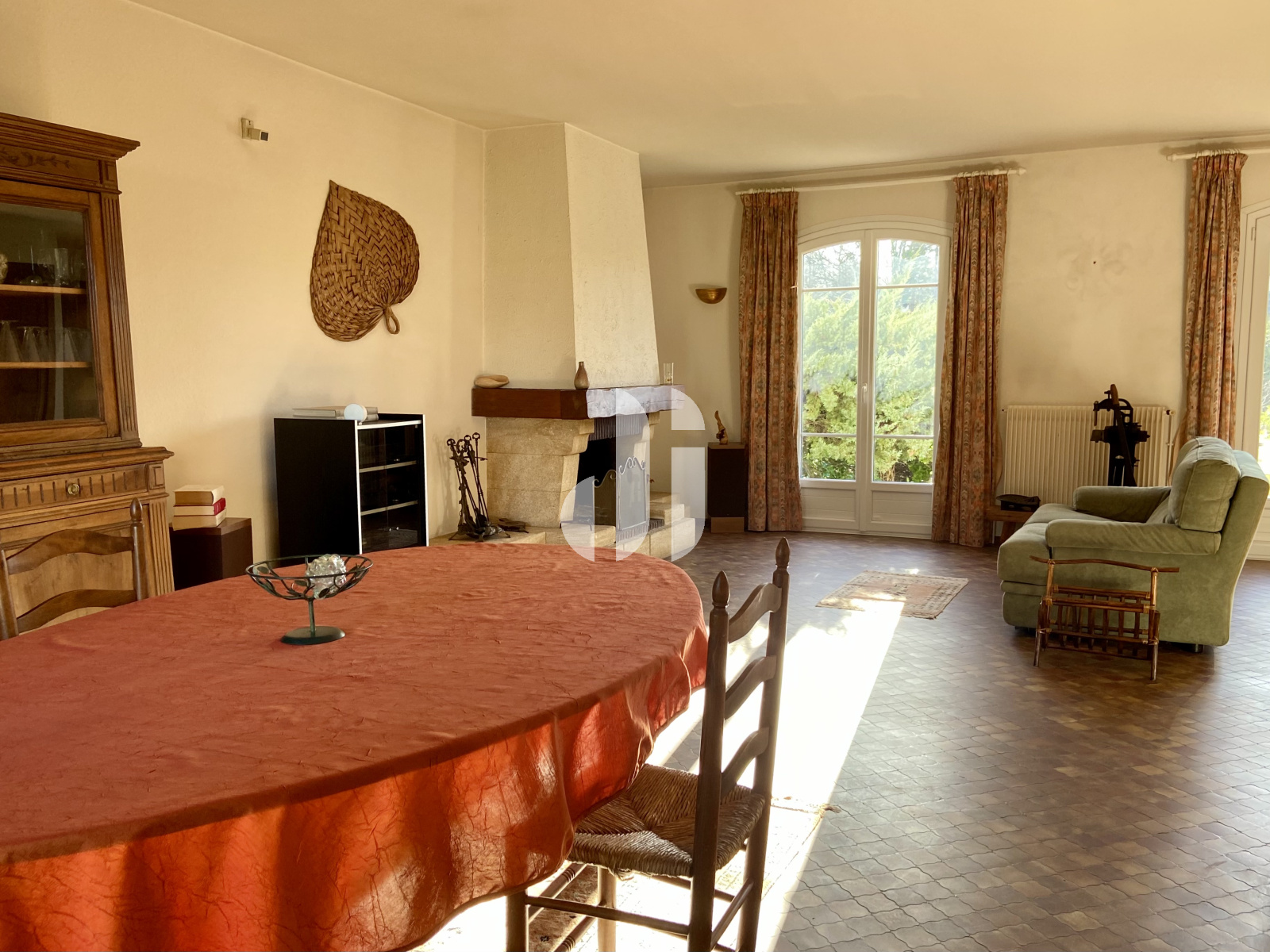 Carrelage.Double expo SO - NE.Cheminée en pierres foyer ouvert. 3 porte-fenêtre PVC avec DV d'environ 10 ans.