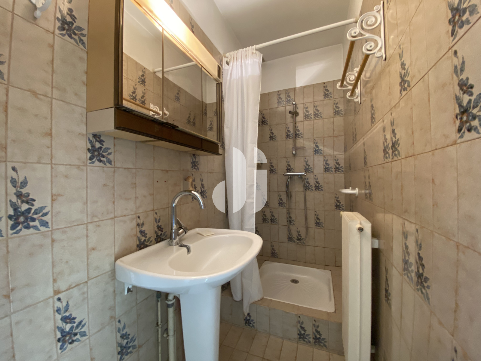 carrelage, douche avec bac receveur émail, simple vasque. Aération naturelle au plafond.