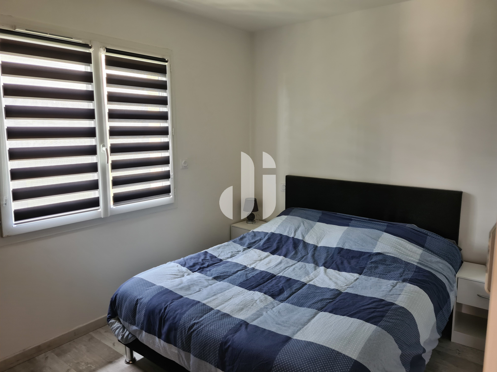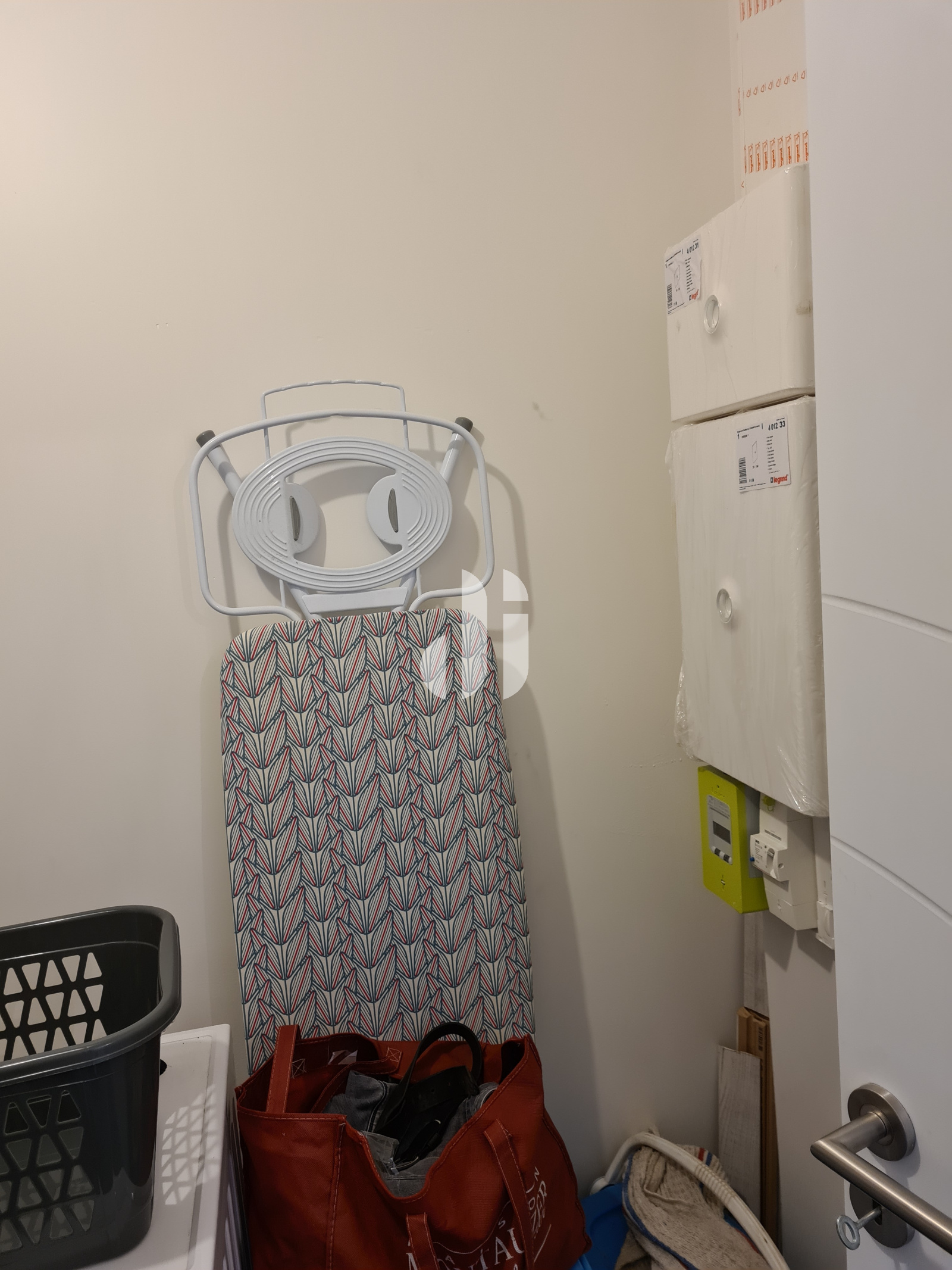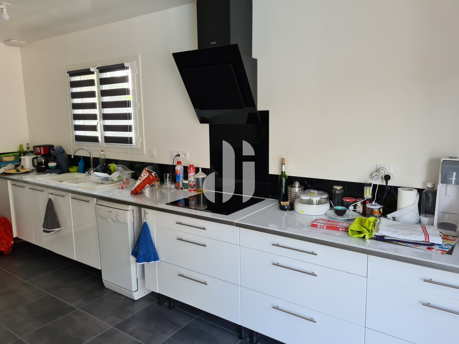 Cuisine équipée d'une plaque à induction marque FAR - hotte design marque SABA - Meuble sous évier 3 portes bas - un meuble bas une porte - crédence en verre noir - un meuble bas + un tiroir à épices - 3 meubles bas - 2 casseroliers + 2 tiroirs - un meuble bas 2 casseroliers + 2 tiroirs - un meuble haut une niche + une porte - store enrouleur jour-nuit gris Dans le séjour un rideau store lamelle - VRE Dans l'entrée, une penderie banc
