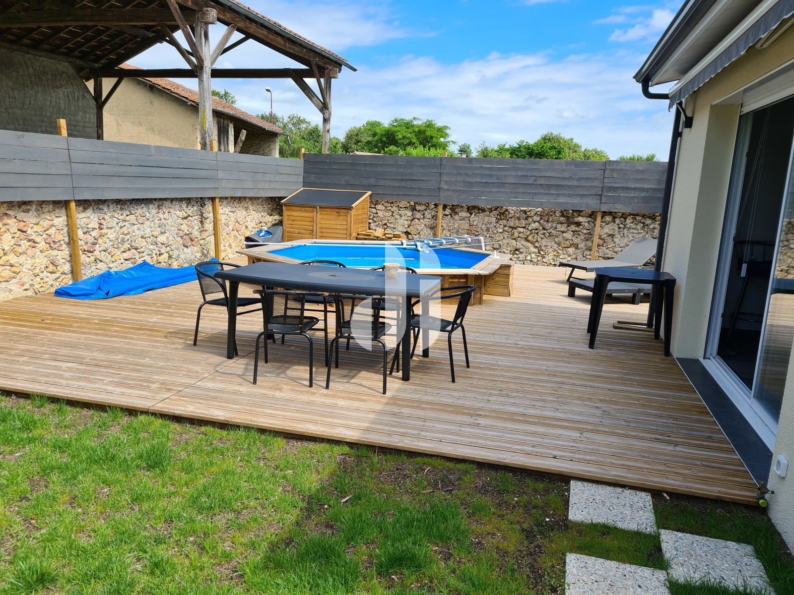 Construction de 2020 encore sous décennale, très belle maison de plain pied composée d'une entrée avec rangement, un séjour avec cuisine américaine meublée et équipée, 2 chambres avec rangements, une salle d'eau avec wc, un wc indépendant en complément, un cellier-buanderie, un grand garage de 25 m². Terrasse bois avec piscine hors-sol sans vis-à-vis.