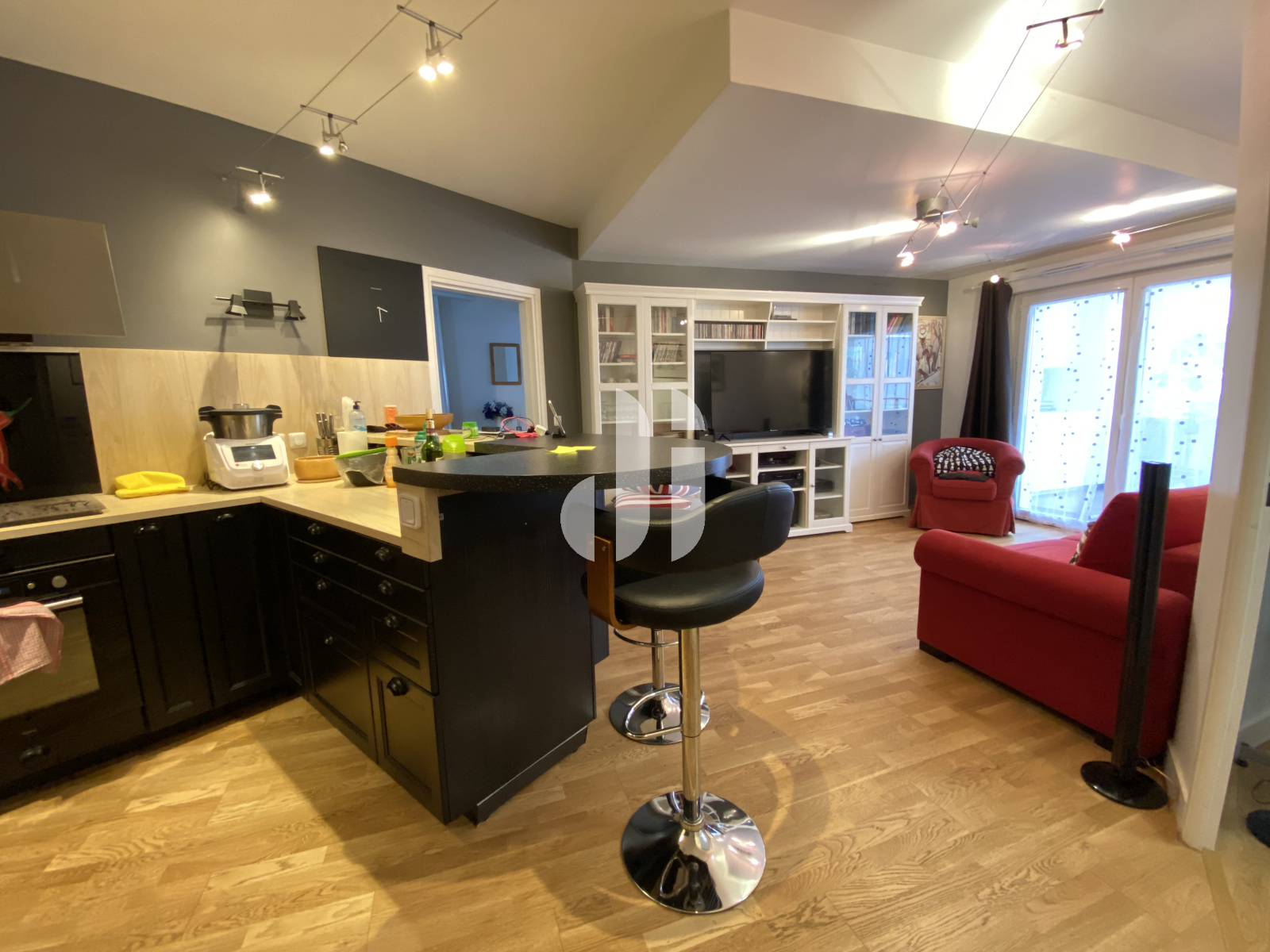 Parquet Massif. Ouvert sur cuisine américaine meublée et équipée (Table induction, hotte, four, micro-ondes, lave-vaisselle, réfrigérateur. Ouverture sur terrasse via porte-fenêtre pvc. Orientation S-SE. Cloison avec CH1 = porteur.