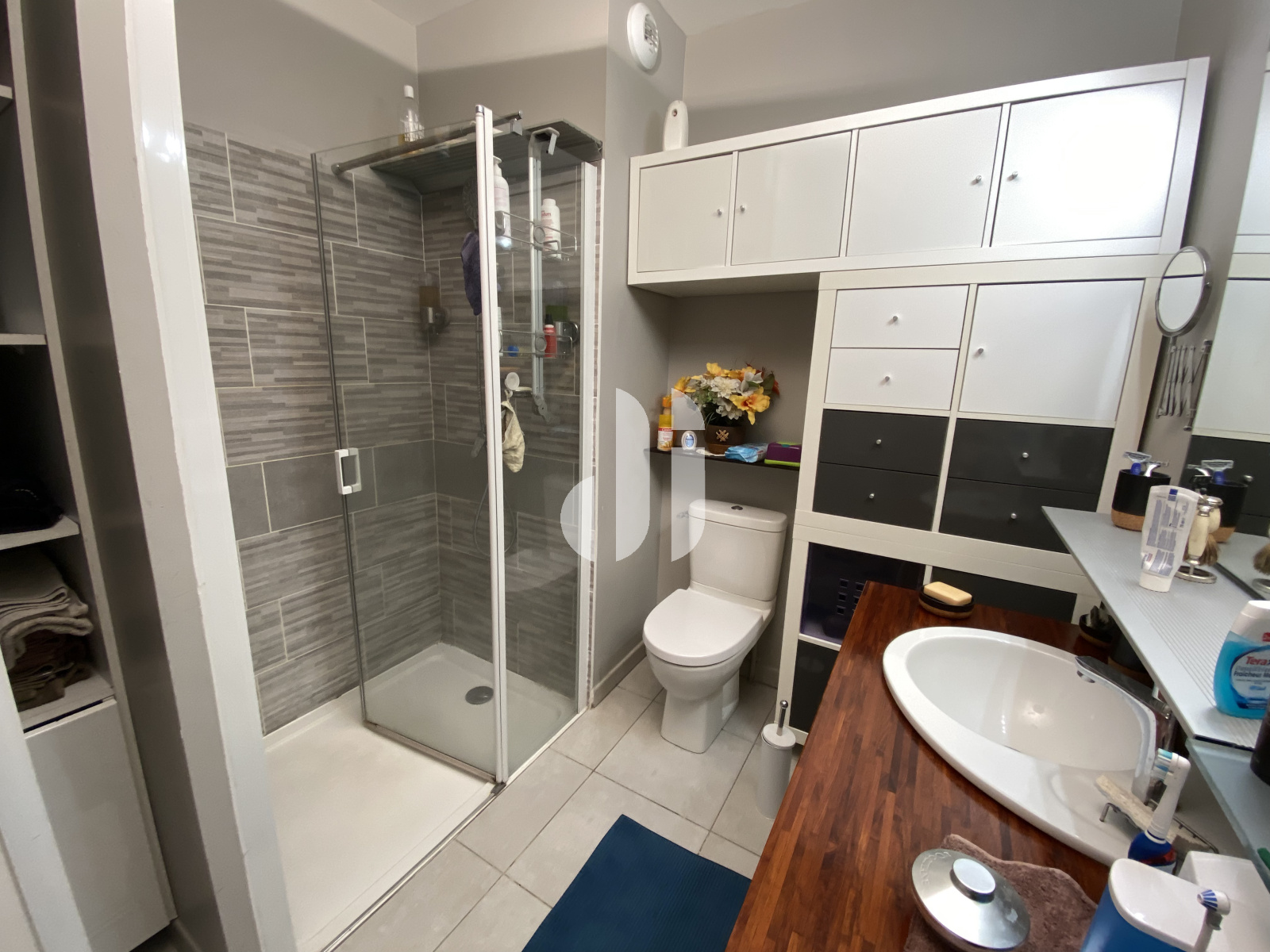Dont 1,54m2 de placards. Commandée par chambre 1. Carrelage. Comprend WC, douche à l'italienne, vasque simple, sèche serviettes. Porte à galandage